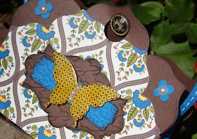 Stampin’ Up Supplies: Papillon Potpourri Stamp Set (W 123757, C 123759); International Bazaar Designer Series Paper (126920); Card Stock: Chocolate Chip (102128), Pacific Point ((111350), Daffodil Delight (119683); Chocolate Chip Ink (126979); Simply Scored (122334); Big Shot (113439); Floral Frames Framelits (127012); Apothecary Accents Framelits (127003); Houndstooth Embossing Folder (123134), Square Lattice Embossing Folder (119976); ½” Circle Punch (119869); Modern Label Punch (119849); Elegant Butterfly Punch (127526); Itty Bitty Shapes Punch Pack (118309); Antique Brads (117273); Pearl Jewels (119247); Pacific Point ¼” Stitched Grosgrain (126878); Heat Tool (129053); Clear Embossing Powder (109130).